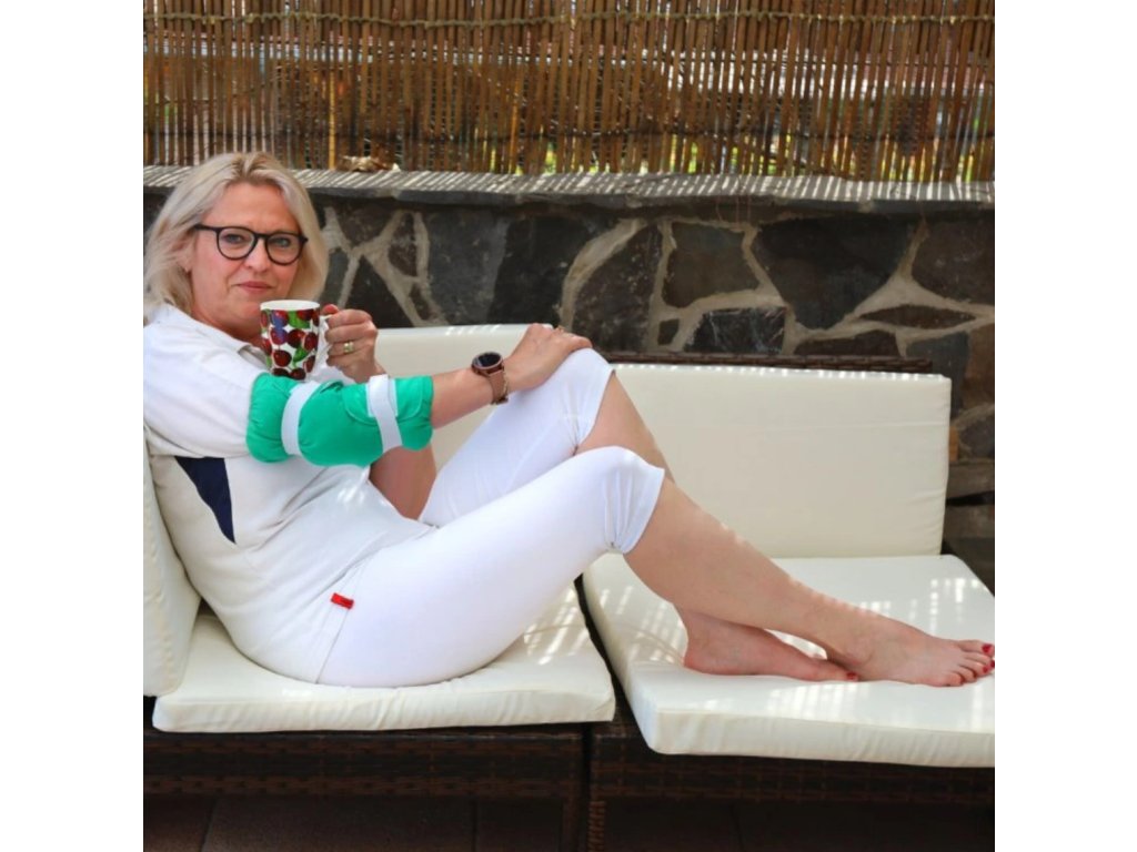 Dobře vyždímaný bavlněný vraťte zpátky do zábalu podvlečením pod pásky. Takto připravený zábal připevněte dvěma gumovými pásky se suchým zipem tak, aby zábal, co nejlépe přilnul k tělu a jeho účinek by tak mohl být co největší.