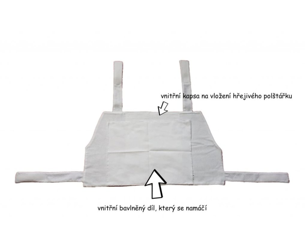 Suchý – teplý zábal je možný použít jako zábal samotný, ale pro zvýšení účinku tepla můžete vnitřní bavlněný díl zahřát např. žehlením. Naše doporučení je použití hřejivých polštářků, které můžete pohodlně nahřát i v mikrovlnné troubě – konkrétně třešňové pecky. Hřejivé polštářky z pohanky hřejí samy od sebe – přesný návod najdete v kategorii hřejivé polštářky.